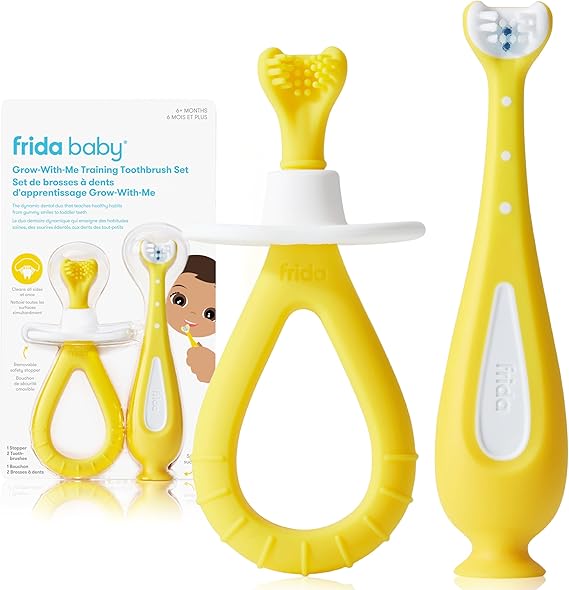 Frida Baby Grow-With-Me Training Toothbrush Set, 2-in-1 Baby & Toddler Toothbrush, Yellow, Manual, Soft Bristles, Silicone Handle, Recyclable, 6-24 Months