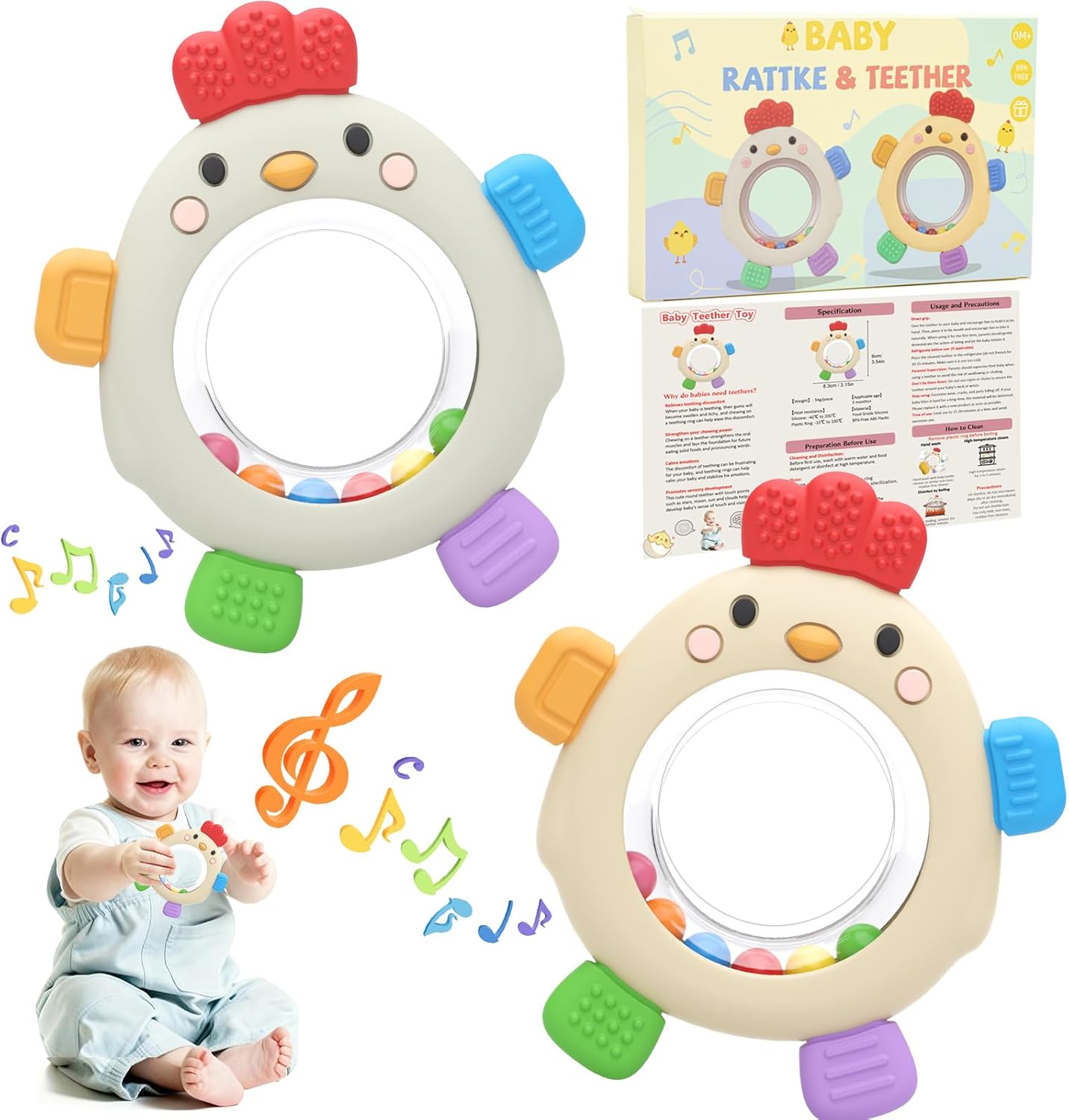 • Rattle & Cute Chicken Design – Adorable chicken-shaped teether with a built-in rattle. Colorful beads make a soft sound that keeps babies engaged and supports sensory growth